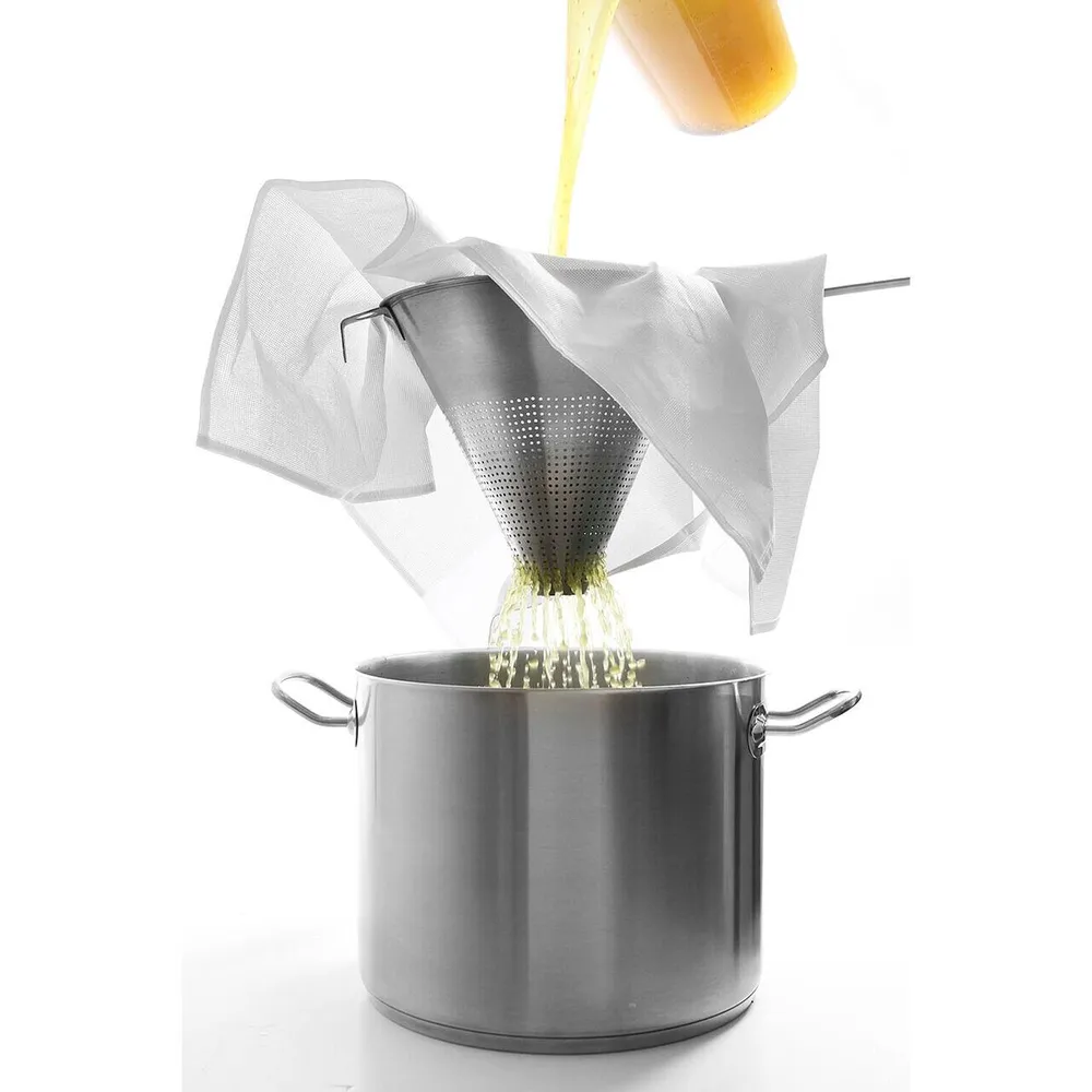 Plasa fina si forma conica permit strecurarea rapida a sosurilor, ciorbelor, cremelor sau aluatului, eliminand impuritatile si imbunatatind textura preparatelor. Manerul ergonomic faciliteaza manevrarea sigura chiar si in timpul operatiunilor de catering sau in laboratoarele de patiserie, oferind confort si control in utilizare.