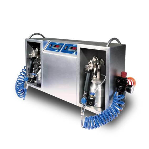 Spre deosebire de modelele standard, aceasta configuratie beneficiaza de o capacitate extinsa si de doua rezervoare de un litru, permitand un flux de lucru mult mai rapid si diversificat. Utilizarea sistemului de pulverizare Airmix asigura o atomizare perfecta a ciocolatei, creand straturi uniforme si aderente. Capacitatea tehnica de a opera intr-un interval de presiune de la 0.5 la 3.5 atm ofera operatorului posibilitatea de a trece de la finisaje fine la texturi mai pronuntate, raspunzand astfel nevoilor specifice ale fiecarui proiect de decorare in doar cateva minute.