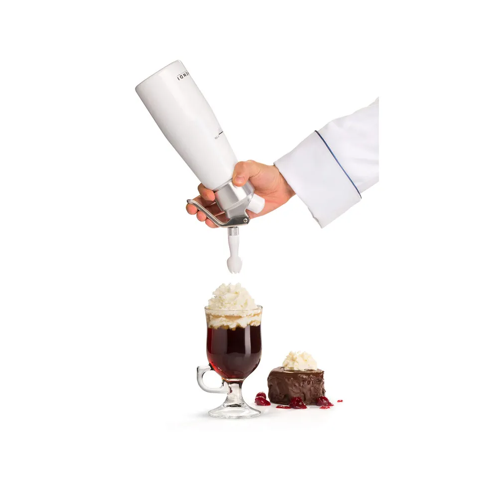 Acest sifon profesional pentru frisca este potrivit pentru o gama larga de aplicatii – de la decorarea prajiturilor si bauturilor pana la prepararea deserturilor aerate. Functioneaza cu incarcatoare cu N₂O (oxid de azot), asigurand o montare rapida si eficienta a cremei. Este important de retinut ca sifonul nu este recomandat pentru sosuri fierbinti, pastrand astfel siguranta utilizatorului si integritatea aparatului. Designul elegant si constructia robusta il transforma intr-o alegere ideala pentru orice unitate HoReCa ce pune accent pe calitate si prezentare.