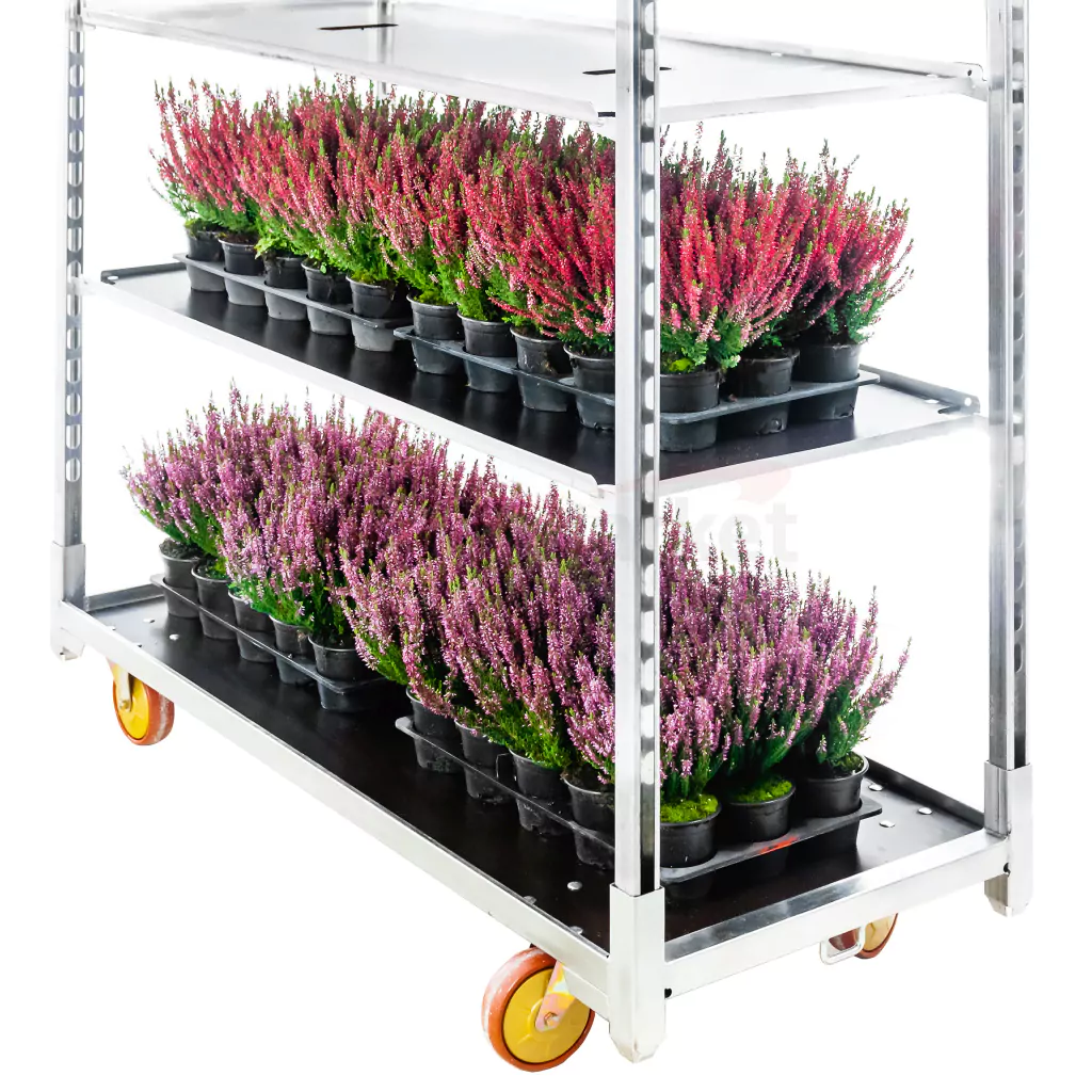 O altă utilizare importantă a acestui carucior este în cadrul piețelor de flori sau al târgurilor de plante, unde mobilitatea și ușurința în manevrare sunt esențiale pentru o gestionare eficientă a produselor. Acest raft pentru flori este extrem de versatil și poate fi utilizat atât pentru expunerea produselor, cât și pentru transportul acestora dintr-un loc în altul fără riscul de deteriorare.