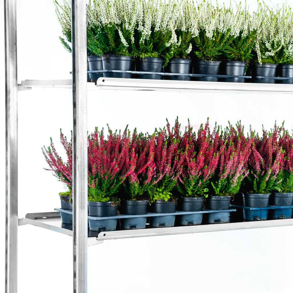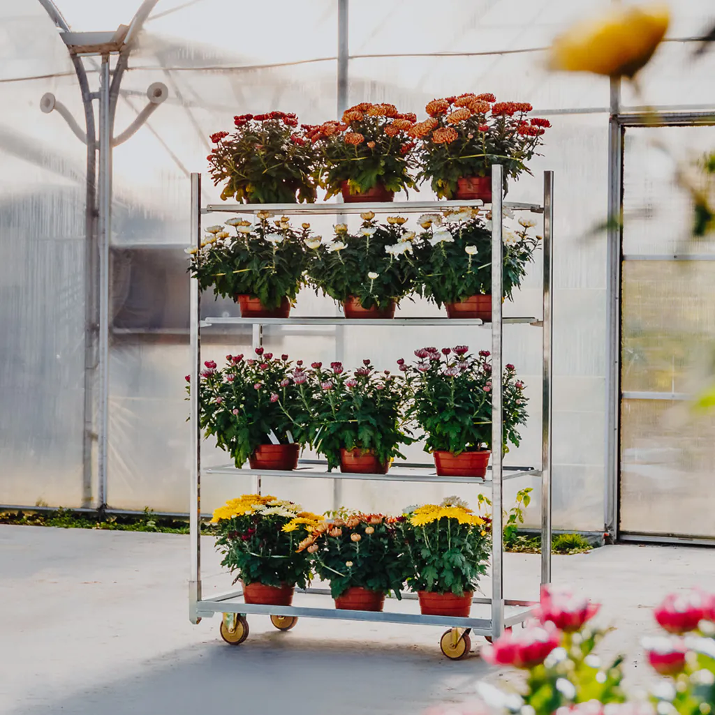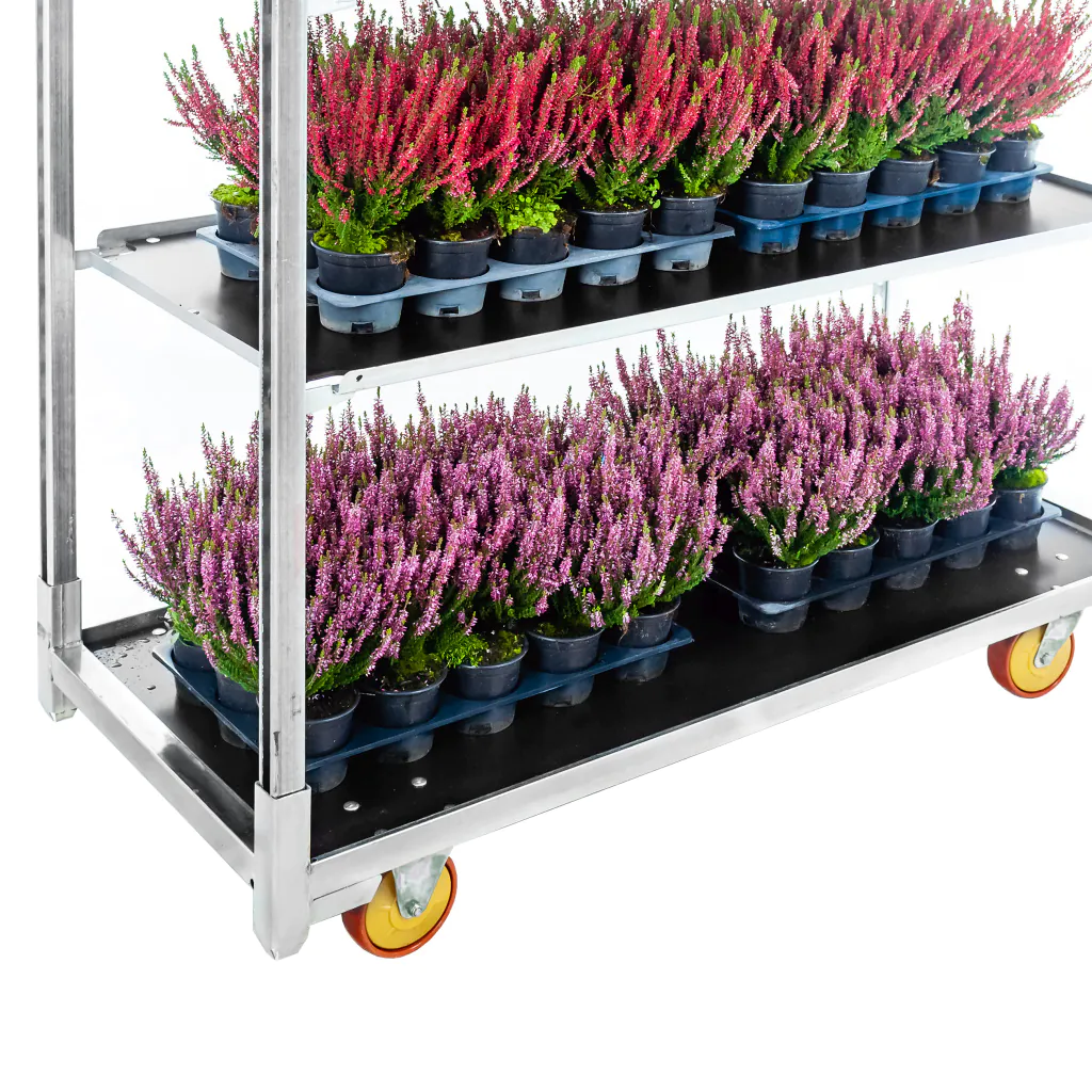 Acest raft pentru flori se remarcă prin versatilitate și durabilitate, având o structură din oțel zincat care protejează împotriva coroziunii. Datorită celor trei rafturi reglabile, utilizatorii pot organiza și transporta plantele în mod eficient, economisind astfel timp și spațiu. Este ideal pentru orice tip de afacere care necesită un transport rapid și sigur al plantelor, cum ar fi magazinele de flori sau centrele de grădinărit.
