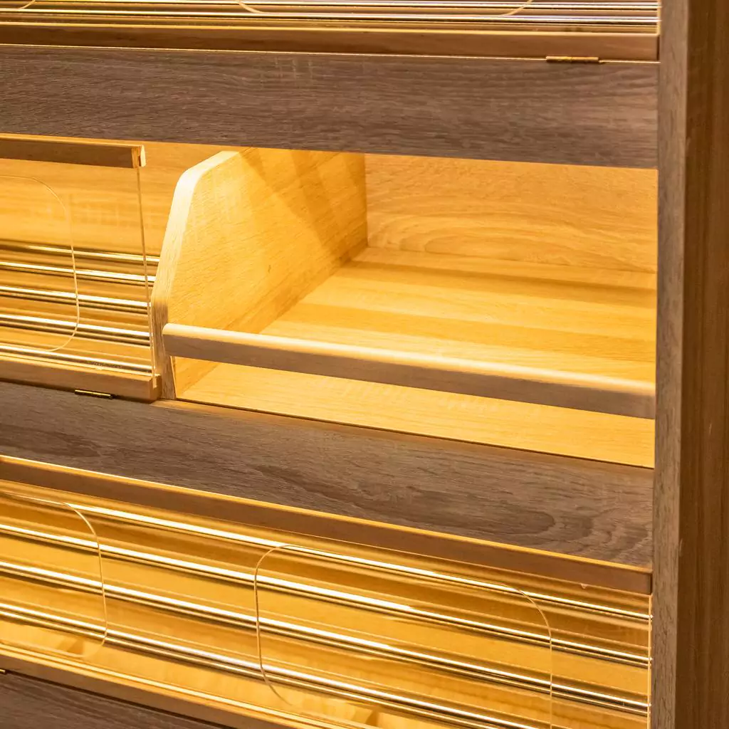 Raftul este dotat cu 5 rafturi spațioase, dintre care 4 sunt realizate din plexiglas, iar raful inferior este compartimentat în 3 secțiuni, oferind posibilitatea de a expune mai multe tipuri de pâine și produse de patiserie. Acest sistem de organizare nu doar că îmbunătățește accesibilitatea, dar și asigură o expunere eficientă a diverselor produse. În plus, blatul retractabil pentru cruste face curățarea mai rapidă și mai simplă, menținând un mediu igienic.