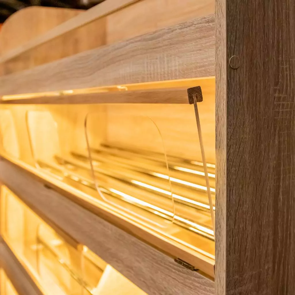 Un alt avantaj semnificativ al raftului pentru pâine este iluminarea LED, care pune în evidență produsele expuse. Iluminarea LED adaugă un efect vizual spectaculos, atrăgând atenția clienților asupra produselor de panificație și creând o atmosferă caldă și primitoare. În plus, tehnologia LED este eficientă din punct de vedere energetic, ceea ce face ca acest raft să fie o soluție economică pe termen lung.