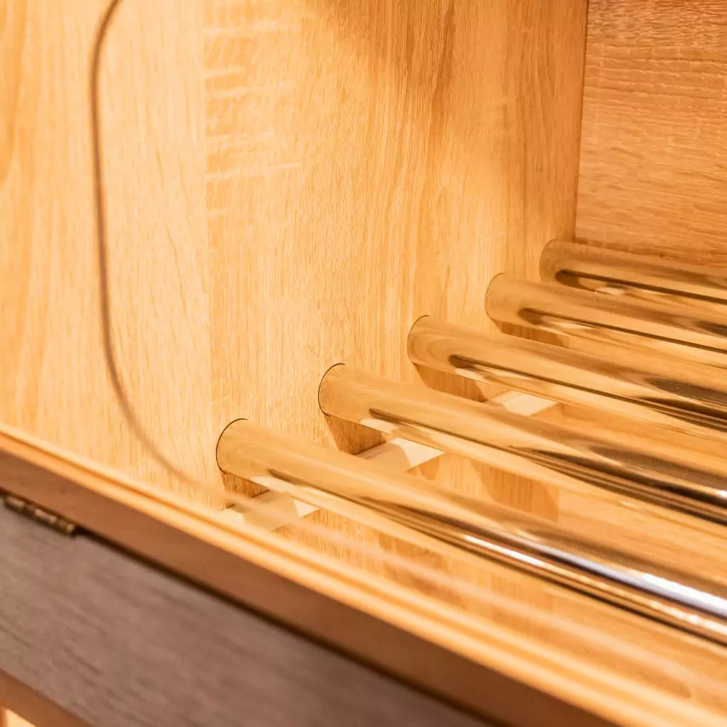 Raftul pentru pâine este creat din lemn de stejar american cu un finisaj natural, care se integrează perfect în orice decor al unităților comerciale. Cu dimensiuni generoase, de 180 cm înălțime, 125 cm lățime și 60 cm adâncime, acest raft oferă suficient spațiu pentru expunerea unei varietăți mari de produse de panificație. Designul său modern este nu doar practic, ci și estetic, adăugând un plus de rafinament în spațiile comerciale, fie că este vorba de o pizzerie, o laborator de patiserie sau un magazin alimentar.