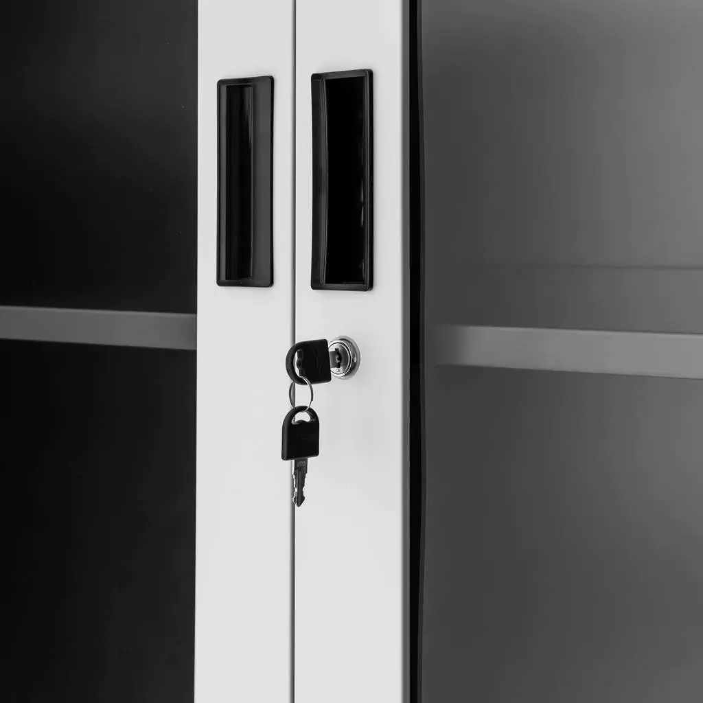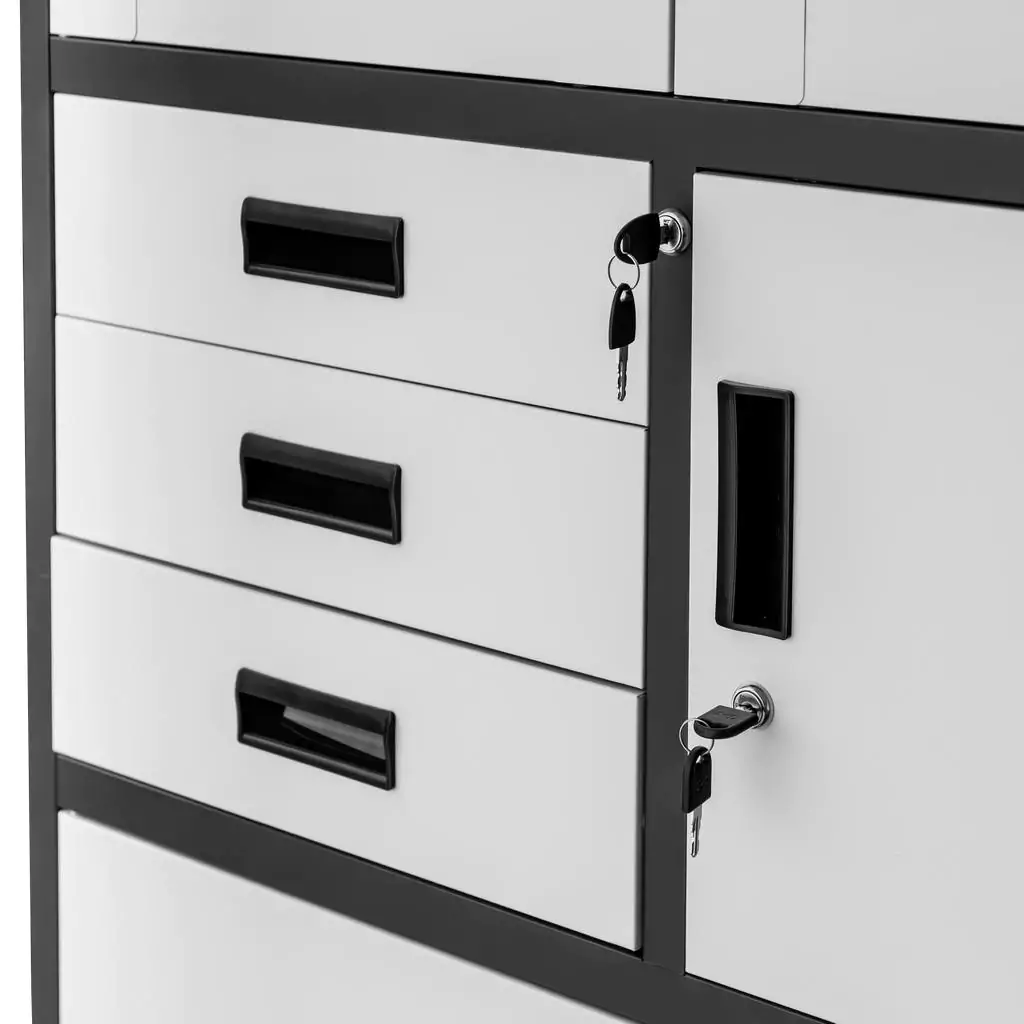 Fiecare secțiune a dulapului este echipată cu un sistem de închidere cu cheie, care asigură protecția documentelor și obiectelor valoroase, respectând standardele de securitate. Seiful ascuns în interiorul dulapului protejează obiectele de valoare și documentele sensibile, oferind un spațiu sigur pentru a depozita echipamentele sau documentele care necesită o protecție suplimentară.