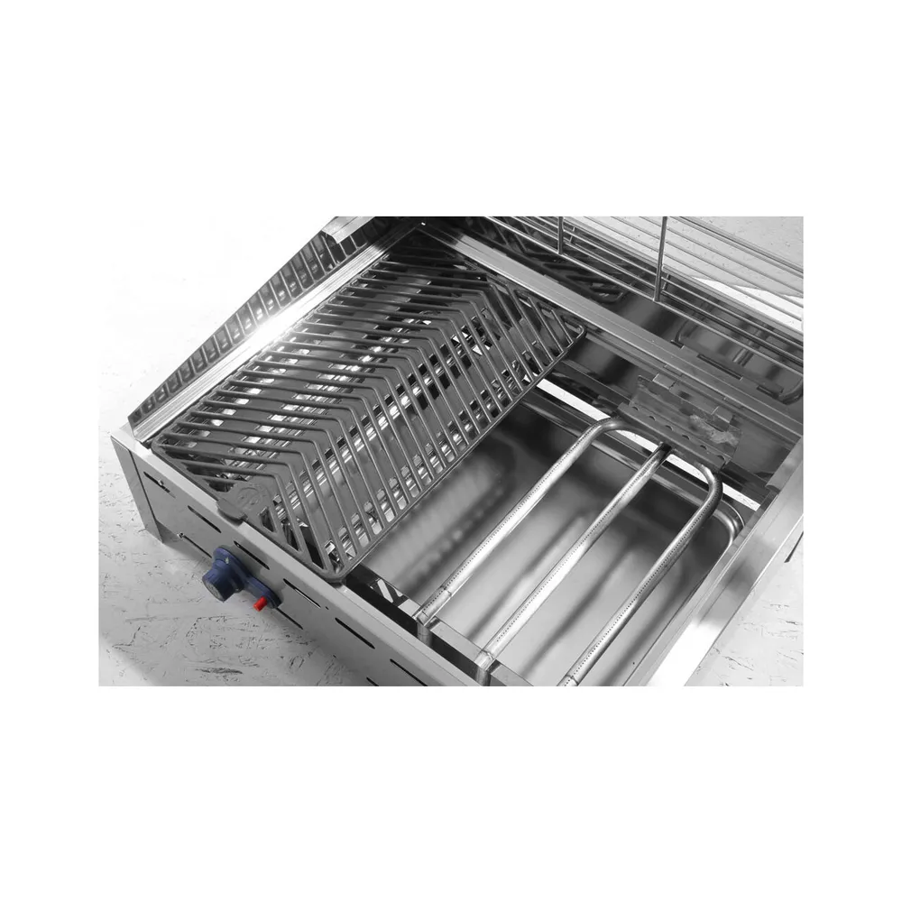 Acest gratar gradina profesional este mai putin sensibil la vant datorita panoului anti-vant din otel inoxidabil si imbunatatirilor aduse arzatoarelor. Gratarul include grilaj GN 1/1 si tava detasabila GN 2/1, facilitand curatarea si intretinerea. Suprafata de lucru poate fi folosita in proportie de 90%, iar grilajul suspendat permite pastrarea alimentelor la cald, sporind eficienta operatiunilor.