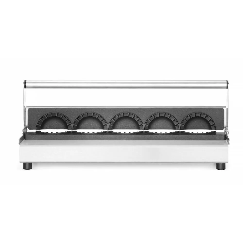 Aparatul pentru găluște cu 5 forme face parte din gama de echipamente profesionale dedicate bucătăriilor profesionale, laboratoarelor de patiserie și cofetărie. Acesta permite prepararea simultană a 5 găluște, economisind timp și asigurând consistență în dimensiunea și forma fiecărei porții.