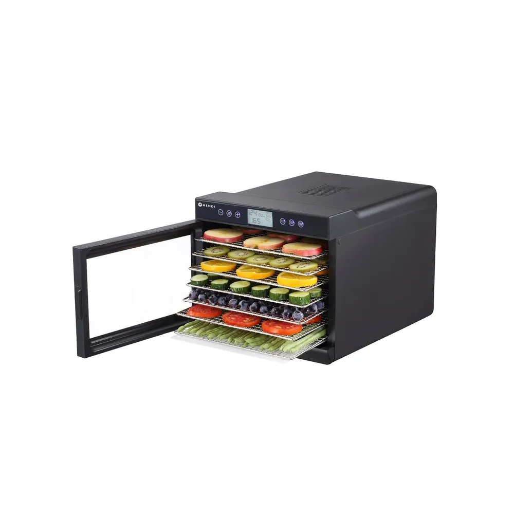 Cu **aparat deshidratat fructe profesional**, puteți obține chipsuri de fructe și legume, ierburi uscate și gustări sănătoase pentru întreaga familie. Panoul digital de control și temperatura reglabilă între 35-70°C permit ajustarea procesului în funcție de tipul alimentului, oferind rezultate uniforme fără a fi nevoie de rotirea tavilor. Timerul integrat asigură control precis al timpului de deshidratare.