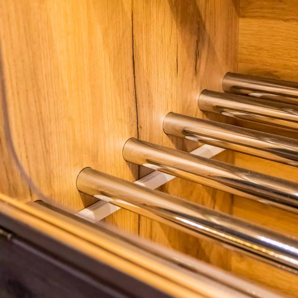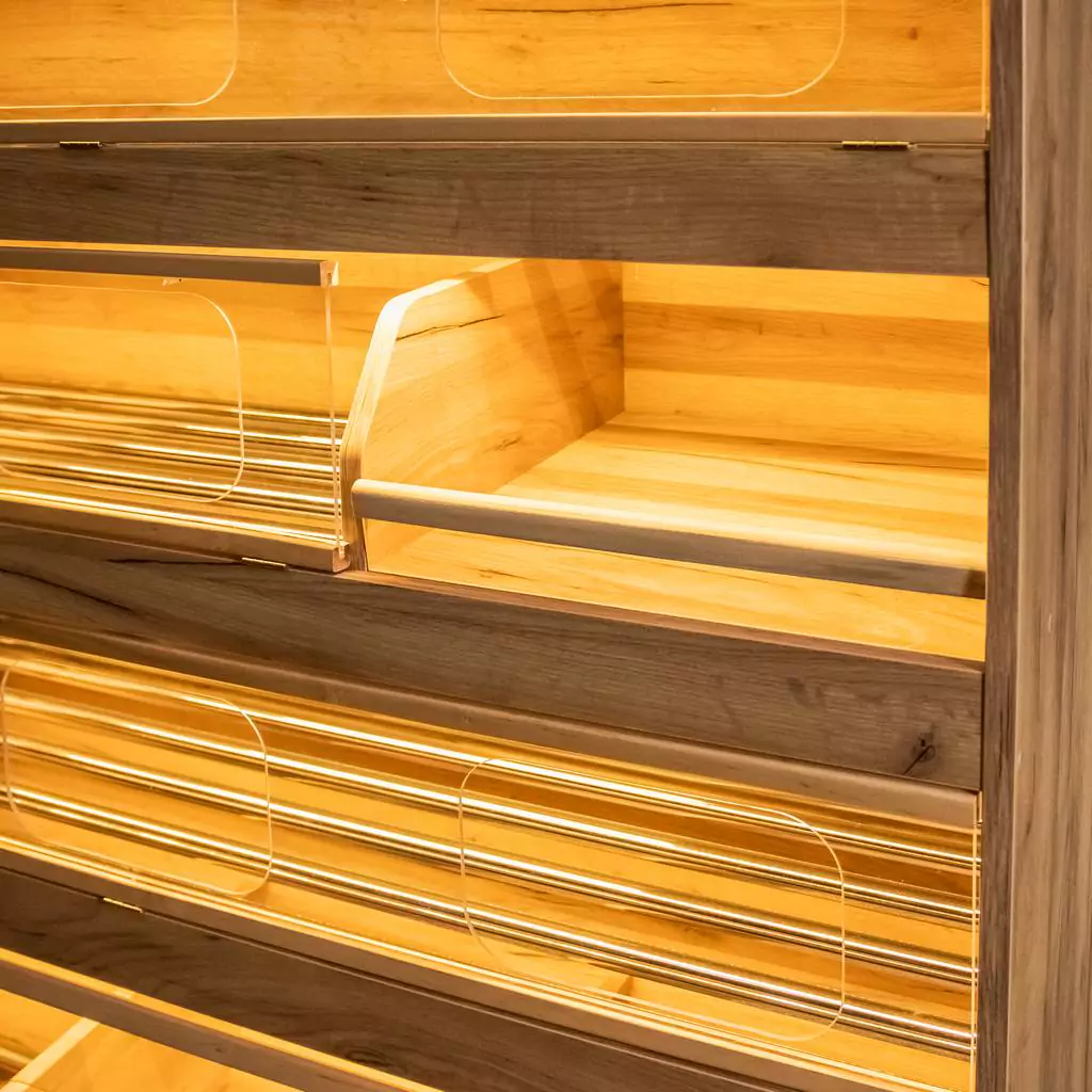 Raftul dispune de 5 rafturi adânci, ideale pentru a organiza produsele de panificație într-un mod sistematic și eficient. Raftul inferior este echipat cu 3 compartimente, perfecte pentru a expune diferite tipuri de pâine sau gustări. În plus, blatul retractabil pentru cruste asigură o curățare rapidă și eficientă, menținând un mediu ordonat și igienic. În acest fel, raftul răspunde nevoilor celor care doresc un echipament ușor de întreținut și de utilizat în orice moment.