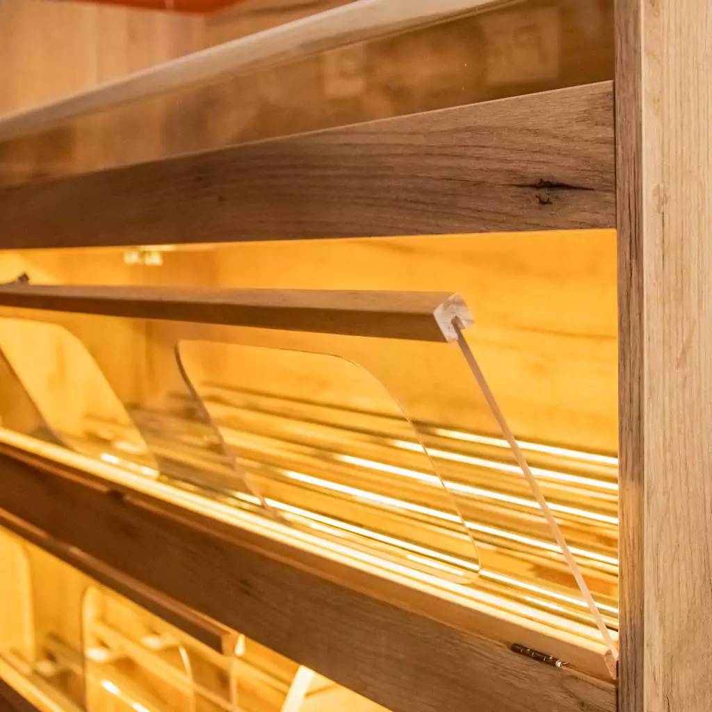 Piesele de panificație sunt expuse într-un mediu protejat datorită materialului de plexiglas de înaltă calitate, care păstrează prospețimea și textura produselor pe o perioadă mai lungă. Acest material protejează împotriva factorilor externi, prevenind uscarea și păstrând pâinea și produsele de patiserie proaspete și moi. În plus, plexiglasul este ușor de curățat, oferind un mediu igienic și sigur.