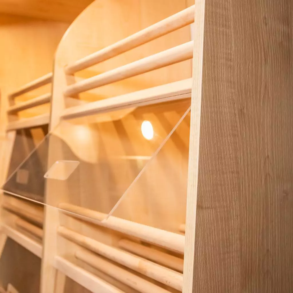 Datorită protecției oferite de plexiglas, produsele expuse sunt protejate de factori externi, cum ar fi praf sau zgârieturi. Astfel, pâinea și produsele de patiserie rămân proaspete mai mult timp. Plexiglasul este ușor de curățat și rezistent la uzură, ceea ce garantează durabilitatea raftului pe termen lung, chiar și în condiții de utilizare intensă. În plus, raftul include o șufladă retractabilă pentru cruste, care asigură o întreținere mai ușoară și păstrarea unui spațiu curat și igienic.