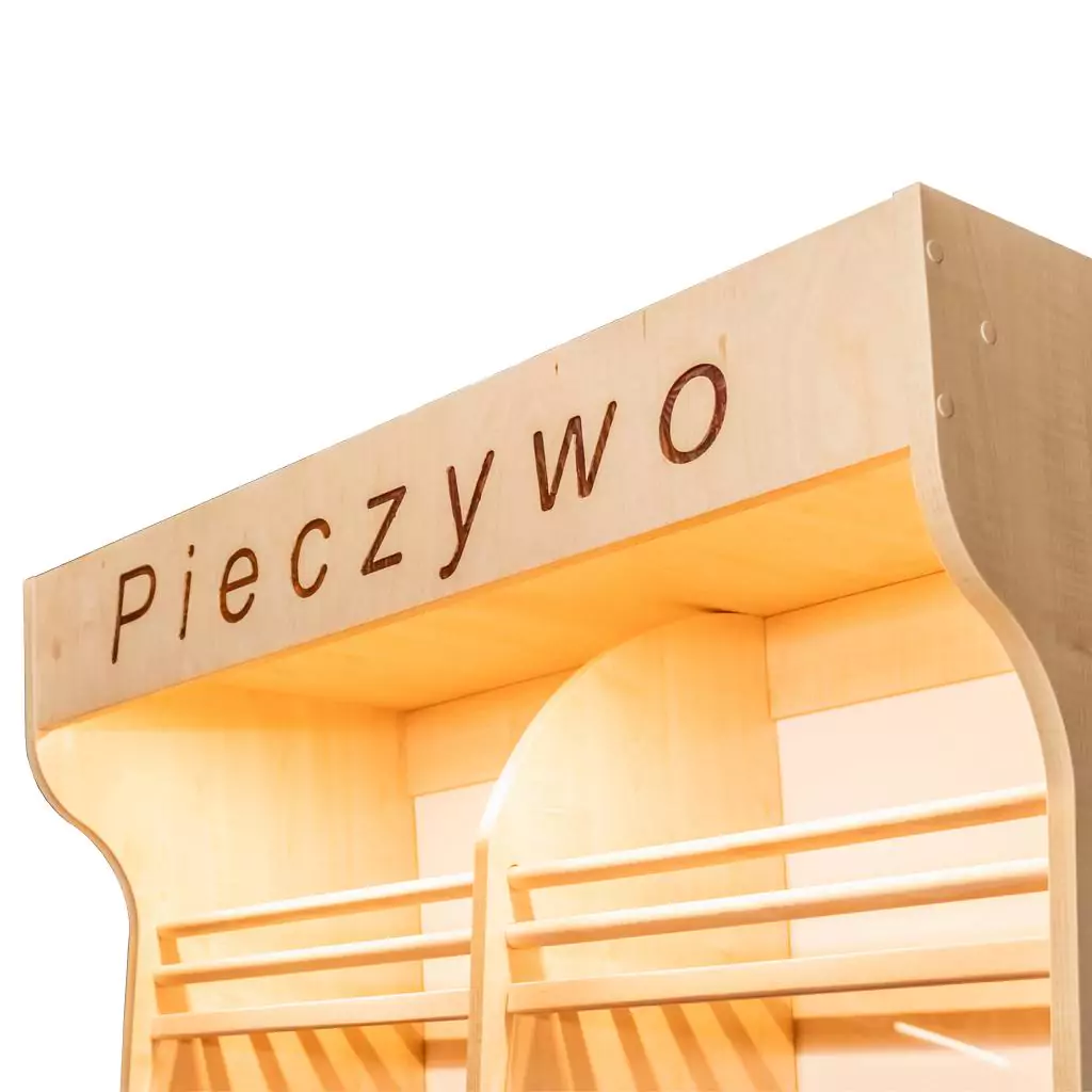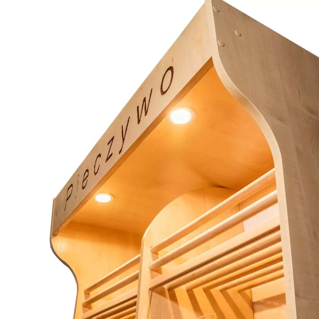 Un alt avantaj important al acestui raft este iluminarea LED, care pune în evidență produsele expuse, creând o atmosferă primitoare și atrăgătoare. Iluminarea de tip LED asigură un consum redus de energie și un impact vizual deosebit, ceea ce face ca raftul să fie nu doar eficient, dar și economic. Lumina intensifică frumusețea produselor de panificație, cum ar fi pâinea proaspăt coaptă și alte bunătăți, atrăgând astfel atenția clienților.