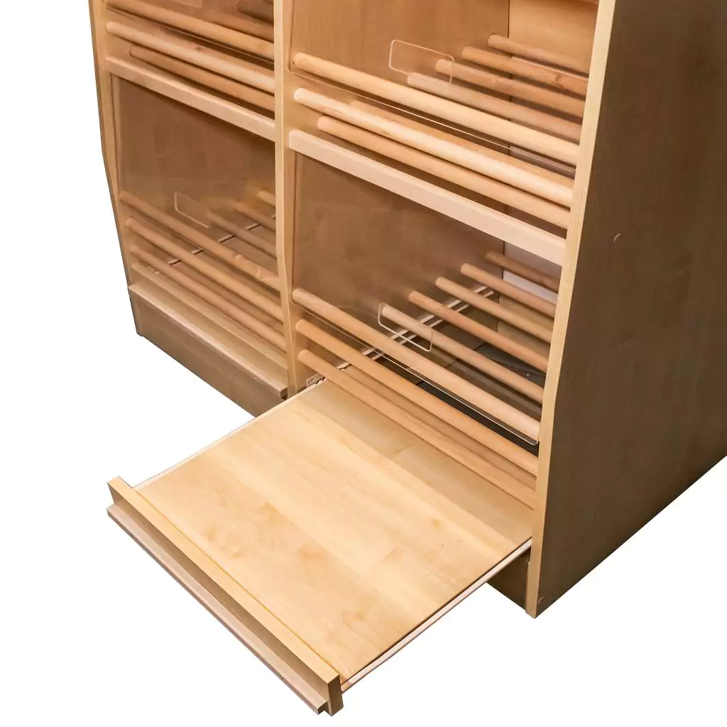 Raftul dispune de 10 rafturi de dimensiuni generoase, care permit o organizare eficientă și accesibilă a produselor. Fiecare raft este realizat din plexiglas, un material rezistent care protejează pâinea și produsele de patiserie, menținându-le proaspete pentru o perioadă mai lungă. Rafturile sunt reglate sub un unghi ușor, pentru a asigura o expunere ideală și un acces rapid pentru clienți, dar și pentru angajați. În plus, blatul retractabil pentru cruste facilitează curățarea rapidă și menținerea unui mediu igienic.