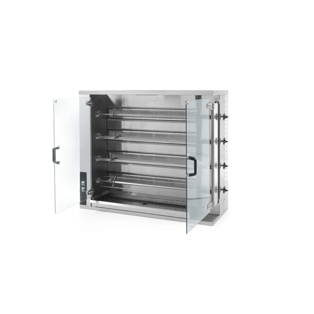 Acest rotisor pui pe gaz profesional este conceput pentru restaurante, fast-food-uri și unități de catering care au nevoie de prepararea rapidă și uniformă a unui număr mare de pui. Echipamentul combină durabilitatea inoxului cu funcționalitatea avansată, oferind control precis asupra procesului de gătire și vizibilitate completă datorită ușilor din sticlă temperată.