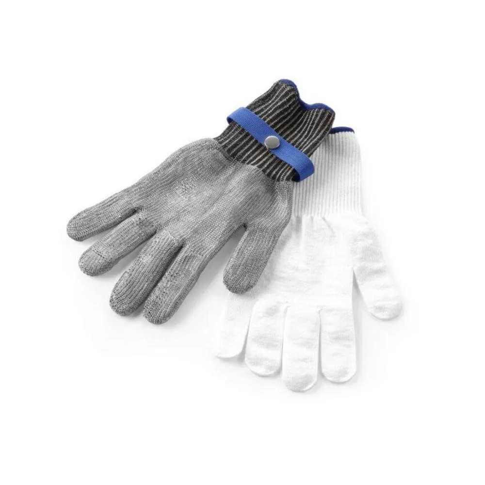 Partea exterioară din oțel inoxidabil asigură rezistență la tăiere și contact alimentar aprobat, în timp ce partea interioară din bumbac garantează confort și stabilitate în timpul lucrului intens. Această combinație face manusa potrivită pentru orice activitate profesională în bucătării sau unități de procesare a alimentelor.