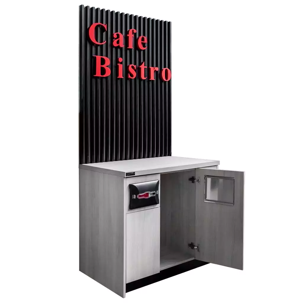 De asemenea, dulapul este echipat cu suporturi pentru cani, un compartiment pentru serbeturi și un loc pentru un coș cu capac inoxidabil, ce ajută la menținerea unui spațiu curat și ordonat. Toate aceste caracteristici sunt gândite pentru a îmbunătăți eficiența și confortul în timpul pregătirii cafelei și pentru a îndeplini cerințele unităților de alimentație publică.